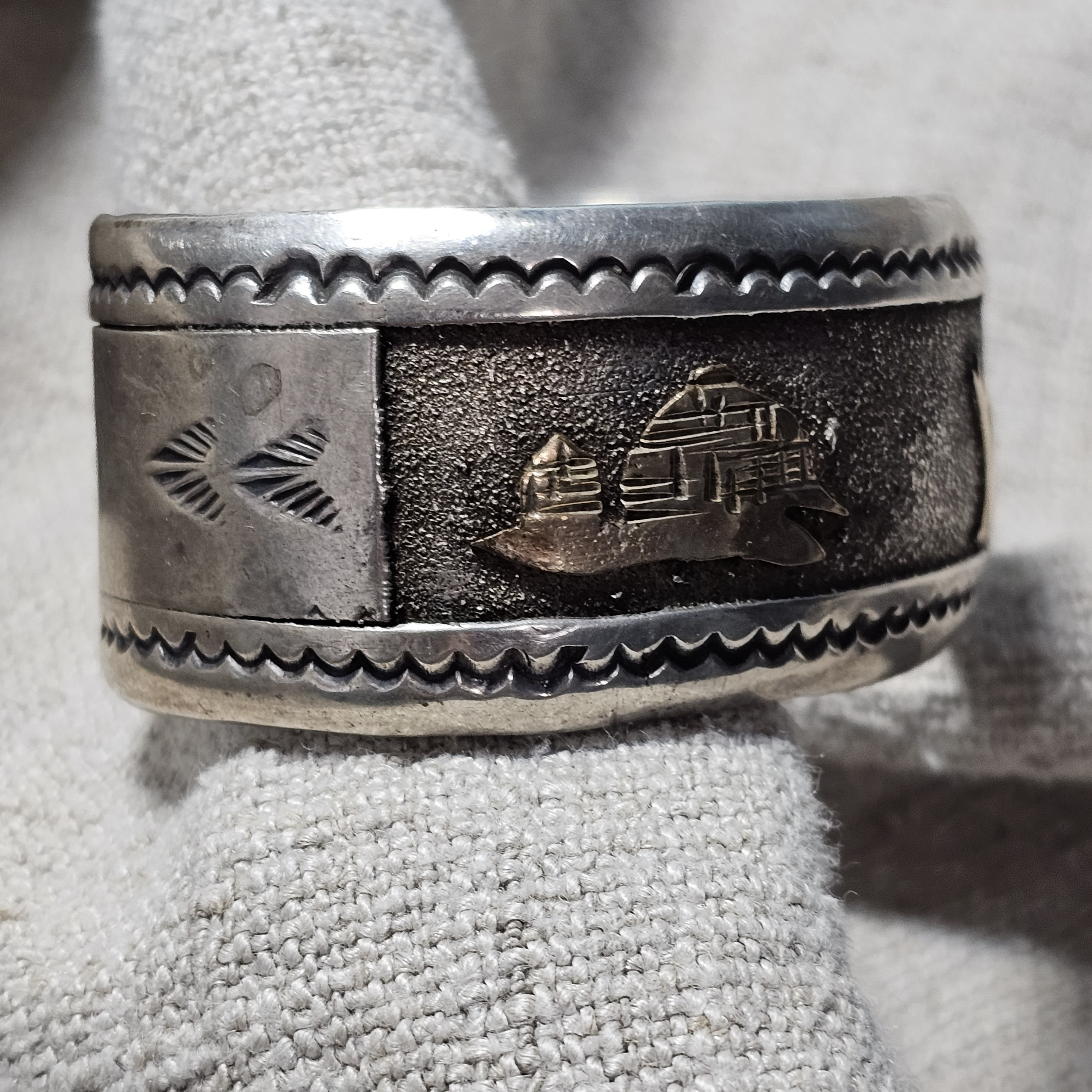 This larger Hopi storyteller cuff has some great gold overlay figures on it. A howling coyote in the center with a hogan on one side and some scenery on the other, all set on a textured background. Nice punch decorated raised edge and tips.
