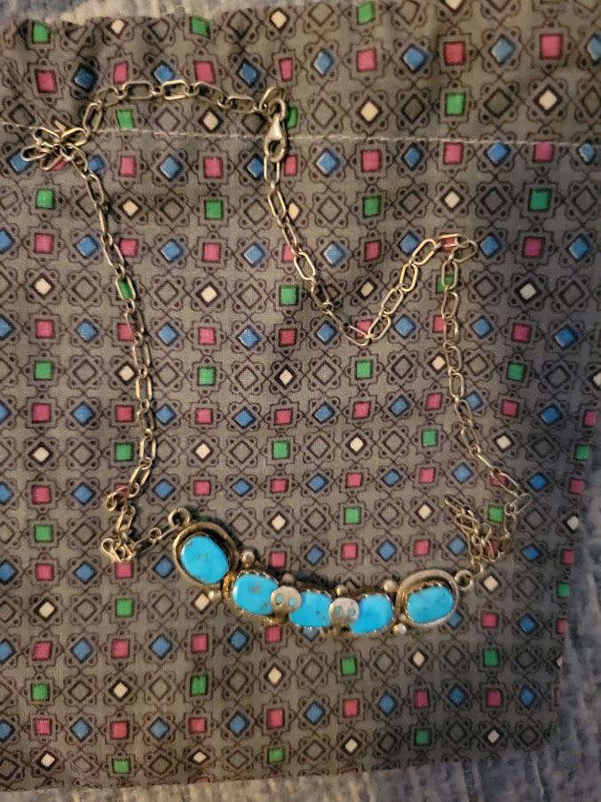 Hard to find Effie Snake necklace. This one has 2 snakes winding around 5 Sleeping Beauty turquoise stones set on a bar. Nice silver chain to complete.