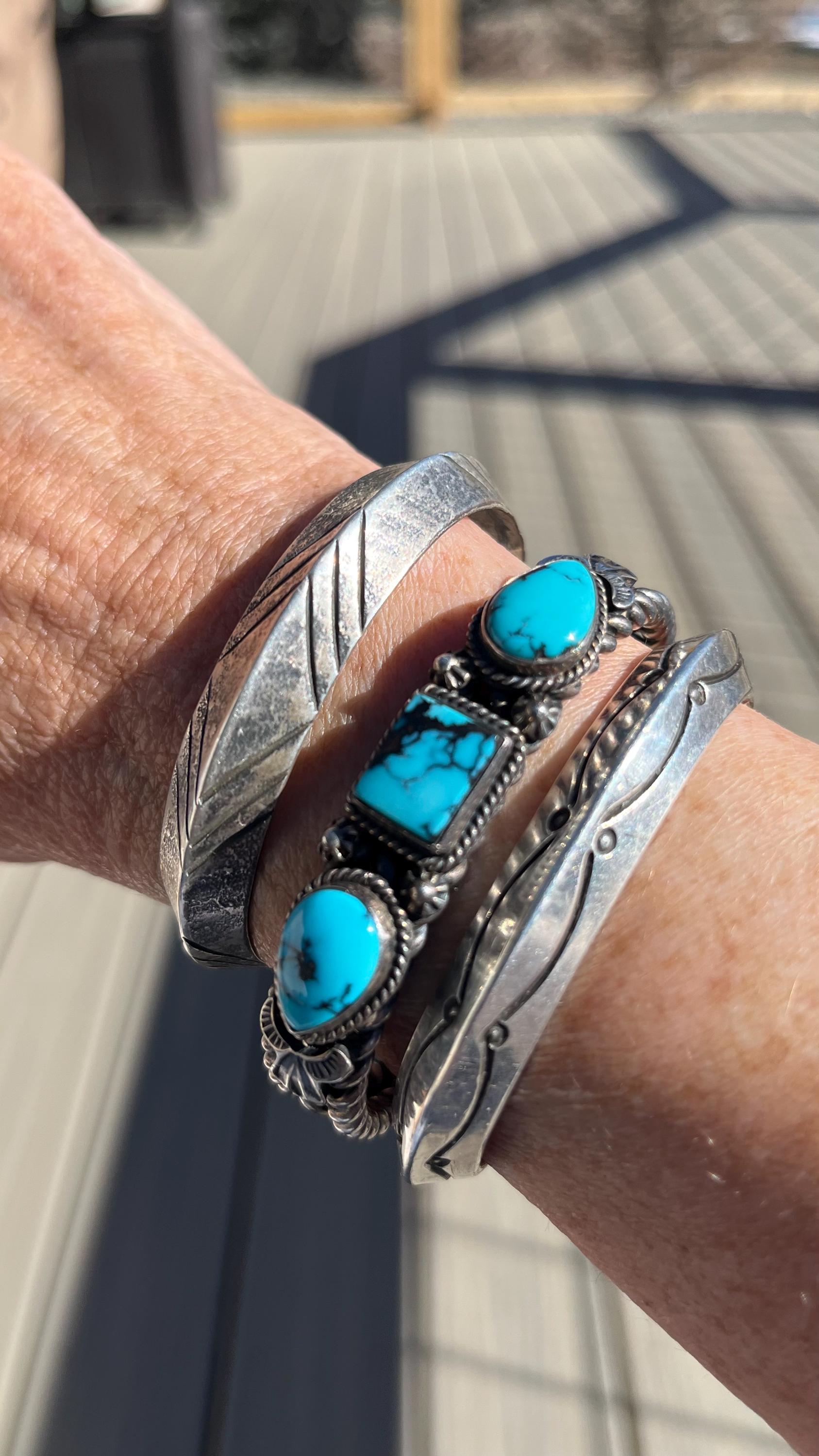 Carinated cuff with good thickness, nice inscribed lines and great old patina. Comfortable to wear alone everyday day or stack. Unmarked like many of the oldies. The bracelet measures 5" inside with a 1" gap, weighs 39 grams. Inventory #JB S1