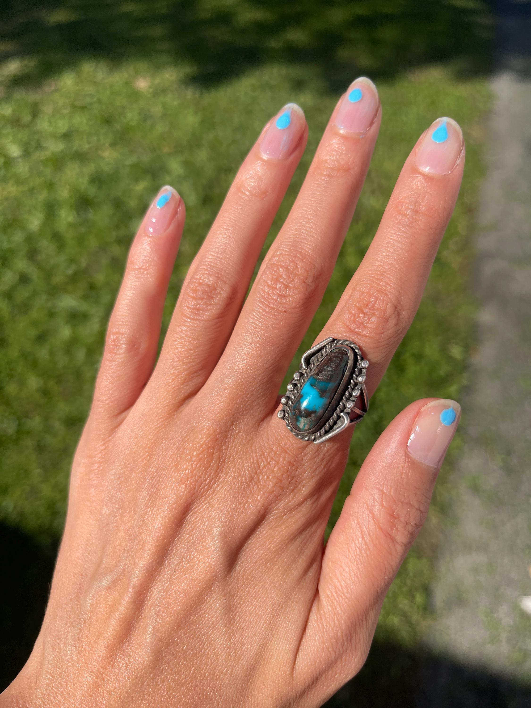 Very nice, hard to find blue bisbee turquoise. Good old condition, great patina.Stamped Y N E Tested silver. Original size never altered.The ring is size 6 1/2 and weighs 11 grams. C 1960sInventory #JR 175
